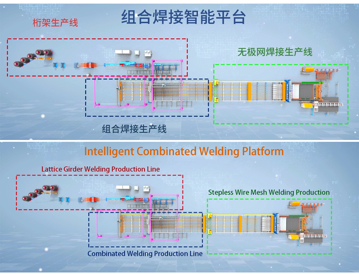 The Intelligent Combinated Welding Production Line consists of a Lattice Girder Welding Production Line, a Stepless Wire Mesh Welding Production Line, and a Combinated Welding Production Line. This production line breaks the traditional welding method, allowing for custom adjustment of the spacing between the longitudinal rebars of the wire mesh without being constrained by multiples of 50. It can process various specifications of wire mesh, with high automation, efficient construction, labor and material savings, and can effectively improve engineering efficiency and quality.